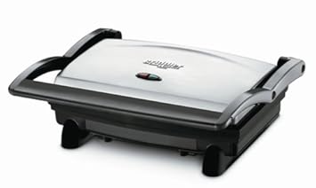 - Panini press and sandwich maker in brushed stainless-steel housing