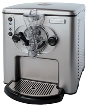 The Ultimate Frozen Dessert Maker - Pro Line by KitchenAid. Prepare a variety of delicious frozen drinks and desserts, including ice cream, frozen yogurt, sorbet, gelato, granita, and margaritas. The horizontal freezing cylinder makes it easy to control "overrun", or the amount of air mixed into a dessert. Brushed stainless steel housing is durable and easy to clean. Freezing cylinder is stainless steel for lasting performance. System begins to chill with the flip of a switch. Most desserts are ready within 30 minutes. When one half-gallon batch is finished, simply add more ingredients to start another. Unequaled convenience that's also great fun! When the freezing cycle is complete, just pull the lever to dispense frozen drinks and ice cream. Built-in funnel and ingredient pusher make it a cinch to add the initial mixture, as well as delicious fruits, nuts, or candy. The unit fits easily underneath will cabinets on the countertop. All parts and assemblies are designed to resist trapping ingredients for sanitary operation and quick cleanup. Comes with a 2-Year Hassle-Free Replacement warranty.